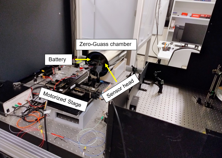 enabling the detection of weak magnetic fields. In preliminary experiments, it was used to study the current distribution within Li-ion battery cells. The experimental setup (Figure 1) employed a motorized stage to generate a complete map of the magnetic field. To ensure measurement accuracy, the sensor head was placed inside a zero-Gauss chamber to shield it from external magnetic fields, including the earth’s field and nearby laboratory equipment.